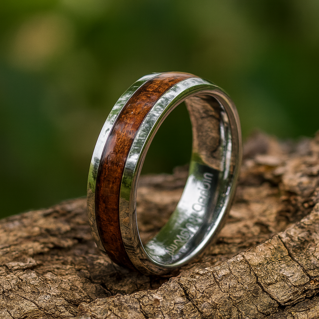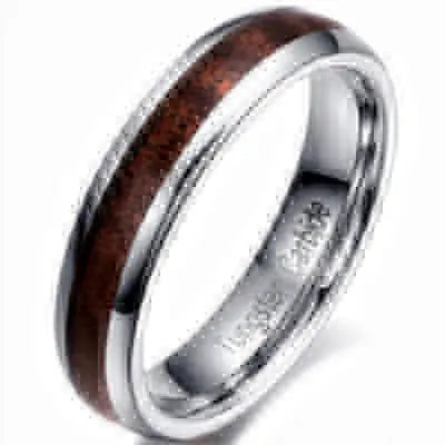 Strength Rooted in Nature The Redwood tungsten wedding band blends rugged durability with the warmth of natural wood. Crafted from premium tungsten carbide, this 6mm band offers exceptional scratch resistance and a polished black finish that contrasts beautifully with the rich wood inlay.