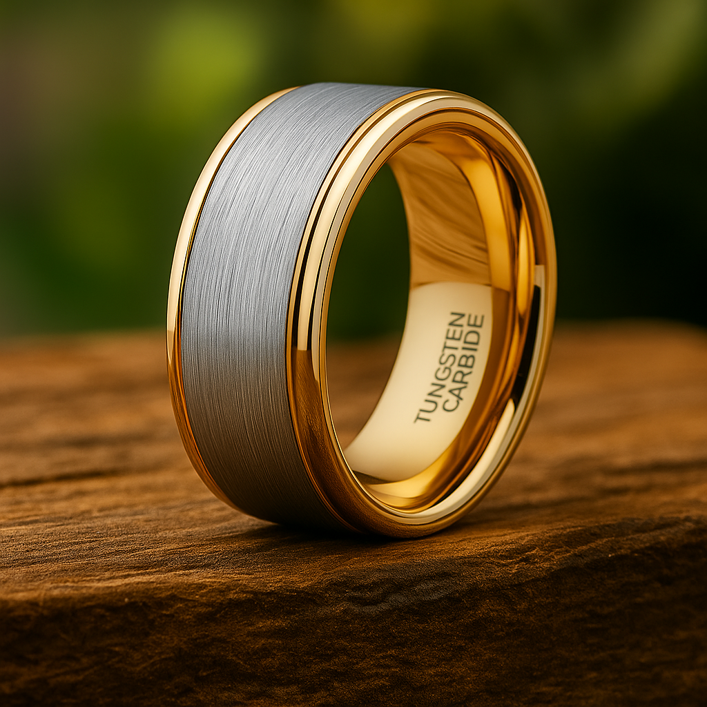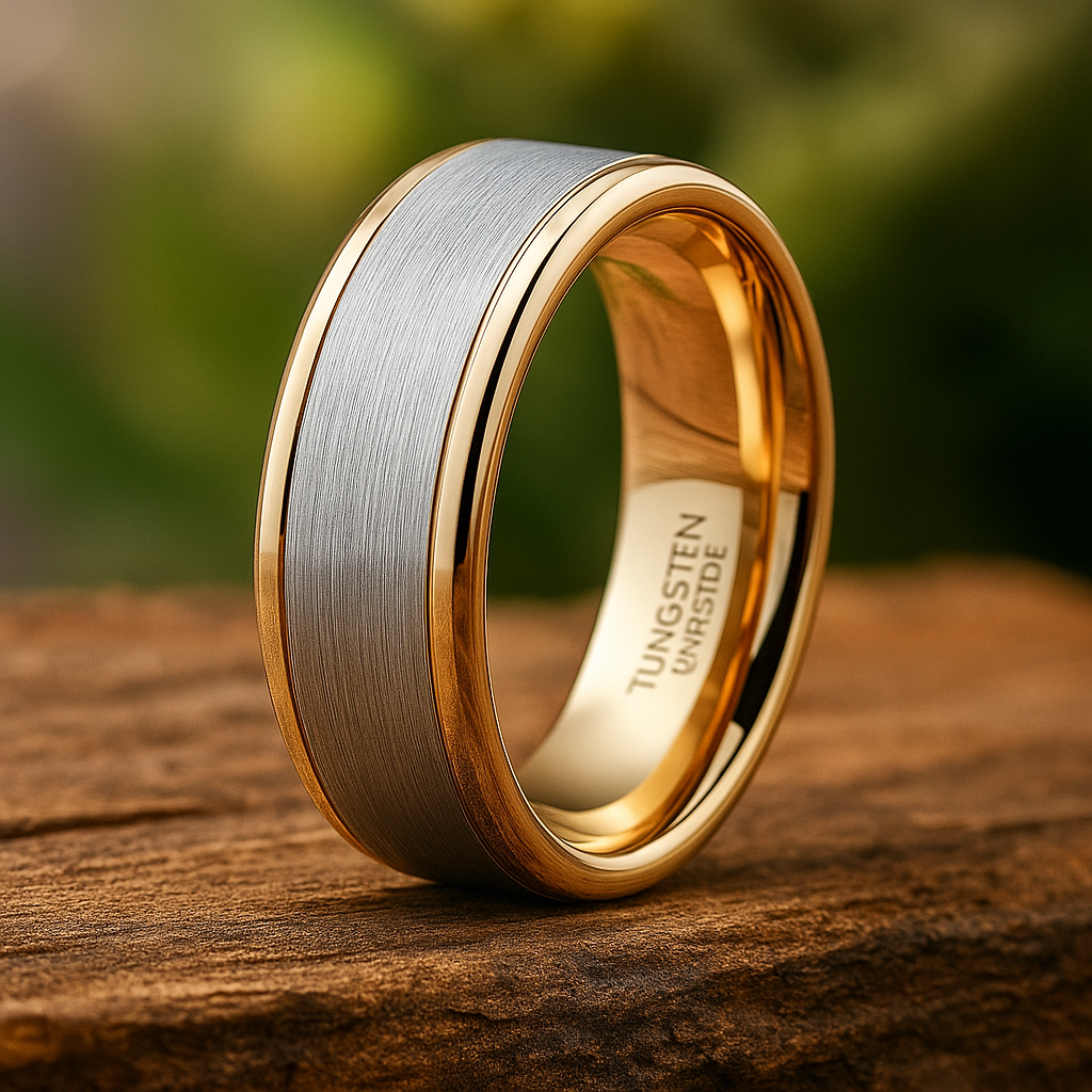 Born of light and balance, Helios is a tungsten ring that reflects harmony between strength and elegance. Forged from solid tungsten carbide, the band pairs a brushed silver center with radiant polished gold edges, creating a profile that is timeless yet modern.